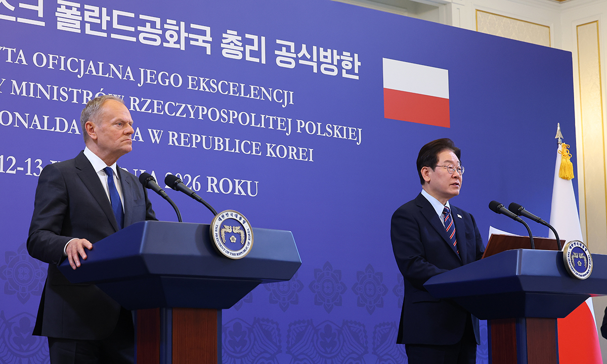 이재명 대통령은 13일 청와대에서 도날트 투스크 폴란드 총리와 정상회담을 갖고 중동 전쟁을 비롯한 국제질서의 격변 속에서 양국 간 협력 관계를 강화하기로 의견을 모았다.