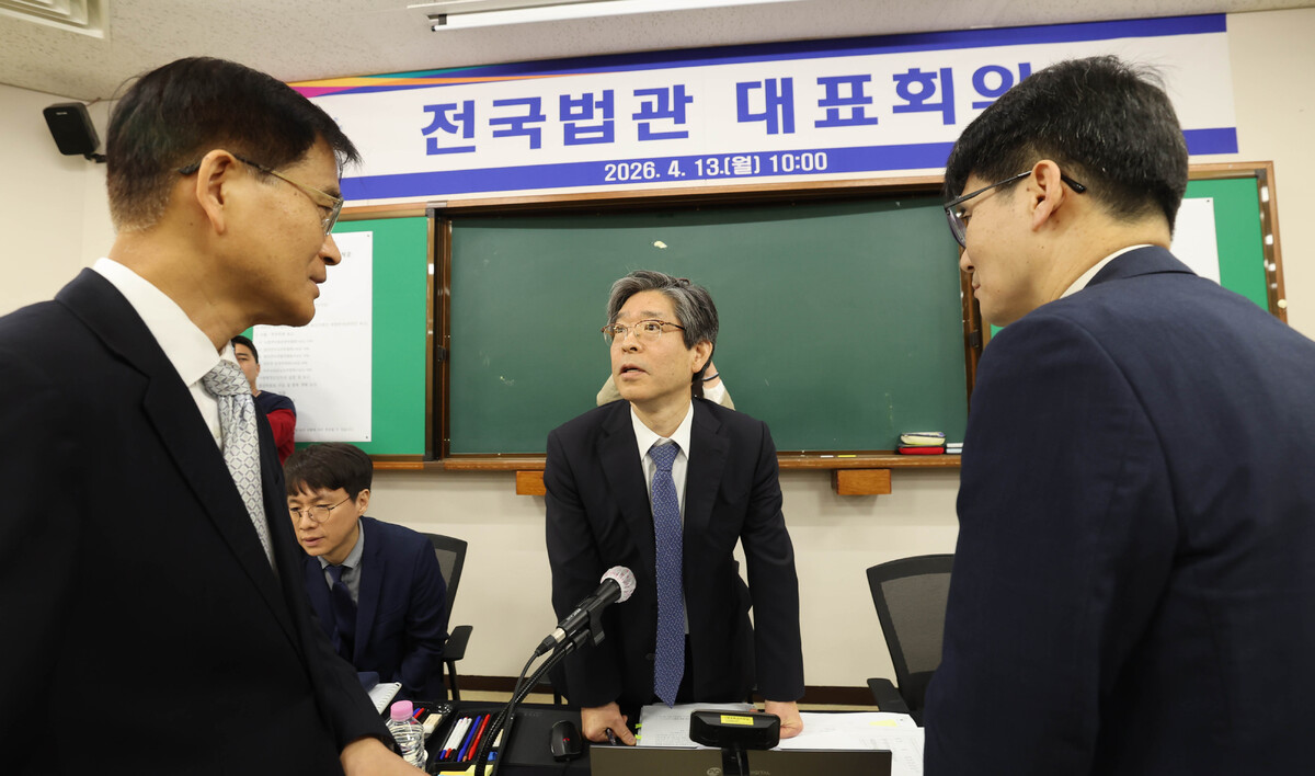 13일 경기 고양시 사법연수원에서 열린 2026년도 상반기 전국법관대표회의 정기회의에서 임시의장인 문광섭 서울고등법원 부장판사(가운데)가 의장 후보인 강동원 서울가정법원 부장판사(왼쪽), 송승용 서울중앙지법 부장판사와 대화하고 있다.