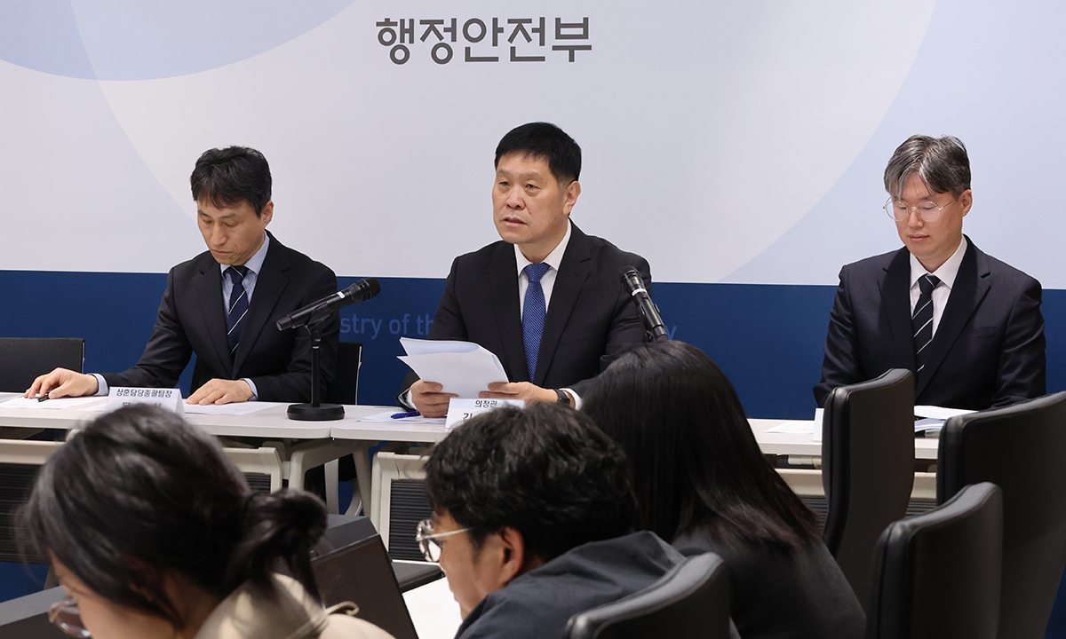 김영수 행정안전부 의정관이 13일 세종시 정부세종청사에서 부적절한 정부포상에 대한 전면 재검토 및 취소 추진방안을 설명하고 있다. 왼쪽부터 문호성 상훈담당팀장, 김영수 의정관, 박동민 사무관. 연합뉴스