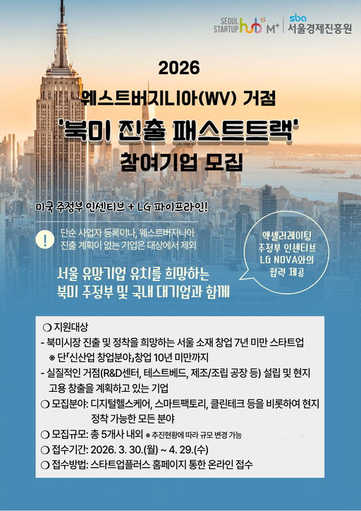 시는 서울창업허브 엠플러스(M+)를 통해 ‘2026 웨스트버지니아 거점 북미 진출 지원 프로그램’에 참여할 기업 5개사를 모집한다고 13일 밝혔다. 서울창업허브 M+는 마곡산업단지를 기반으로 하는 서울시 창업·스타트업 지원 기관이다.
