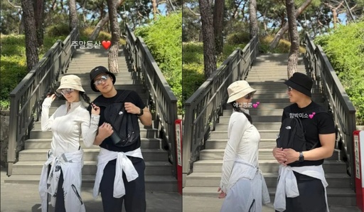 사진 속 두 사람은 밝은 미소와 함께 산책로 계단을 배경으로 서로를 바라보거나 카메라를 향해 포즈를 취했다.