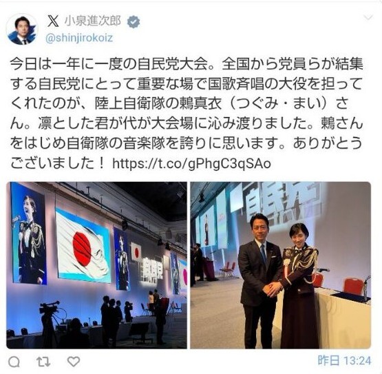 고이즈미 신지로 방위상은 소셜미디어 엑스(X)에 해당 대원과 함께 찍은 사진을 올리고서 “1년에 한 번, 전국에서 당원들이 모이는 자민당의 중요한 행사에서 국가 가창의 중책을 맡은 것은 자위대원이었다. 씩씩한 기미가요가 행사장에 스며들었다”고 했다가 삭제했다. 논란을 의식해 글을 지운 것으로 보인다.
