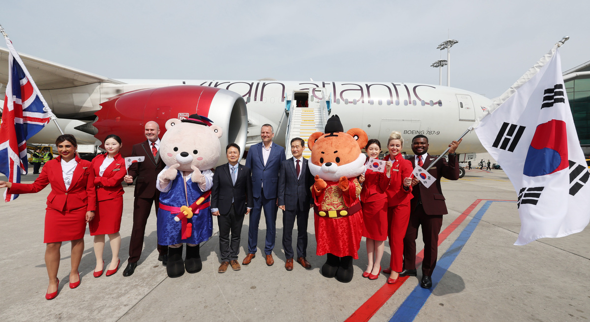 / 14일 오전 인천국제공항 제2여객터미널주기장에 도착한 영국 버진애틀랜틱의 런던 히드로발 항공기 앞에서 코닐 코스터 버진애틀랜틱 최고경영자가 인천~런던 취항을 알리며 한국관광공사 마스코트 무고미, 호종이와 인사를 나누고 있다. 버진애틀랜틱은 인천국제공항과 런던 히드로 공항을 잇는 직항 노선을 주 7회 운항한다. (공항사진기자단) /2026.4.14 이제원 선임기자