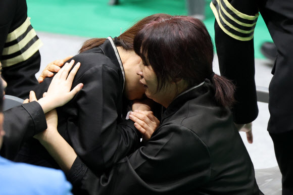 순직한 소방관들과 동고동락했던 동료들도 비통에 잠겼다. 정복을 갖춰 입고 동료의 마지막 가는 길을 배웅하러 온 이들은 추도사가 이어지자 참았던 눈물을 쏟아냈다.