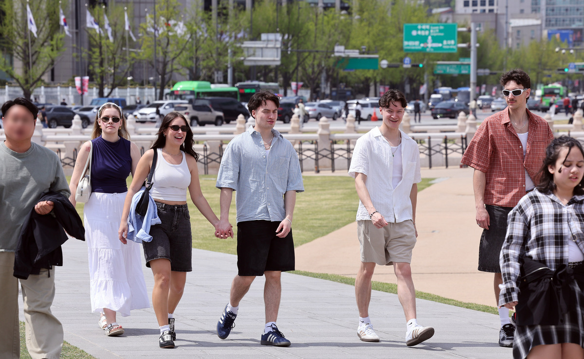 서울의 낮 최고 기온이 28도까지 오르며 때이른 무더운 날씨를 보인 14일 서울 광화문광장에서 짧은 옷차림의 외국인 관광객들이 산책을 하고 있다.