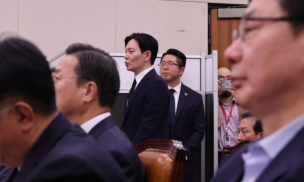 쌍방울 대북송금 사건을 수사했던 박상용 검사(왼쪽 세 번째)가 14일 서울 여의도 국회에서 열린 ‘윤석열 정권 정치검찰 조작기소 의혹사건 진상규명 국정조사 특별위원회’의 쌍방울 대북송금 조작기소 의혹사건 청문회에서 증인 선서를 거부한 뒤 직접 소명하겠다고 말하고 있다. 서영교 특위 위원장은 소명서 서면제출 요구를 거부한 박 검사를 퇴장시켰다. 오른쪽 첫번째는 이화영 전 경기도 평화부지사.