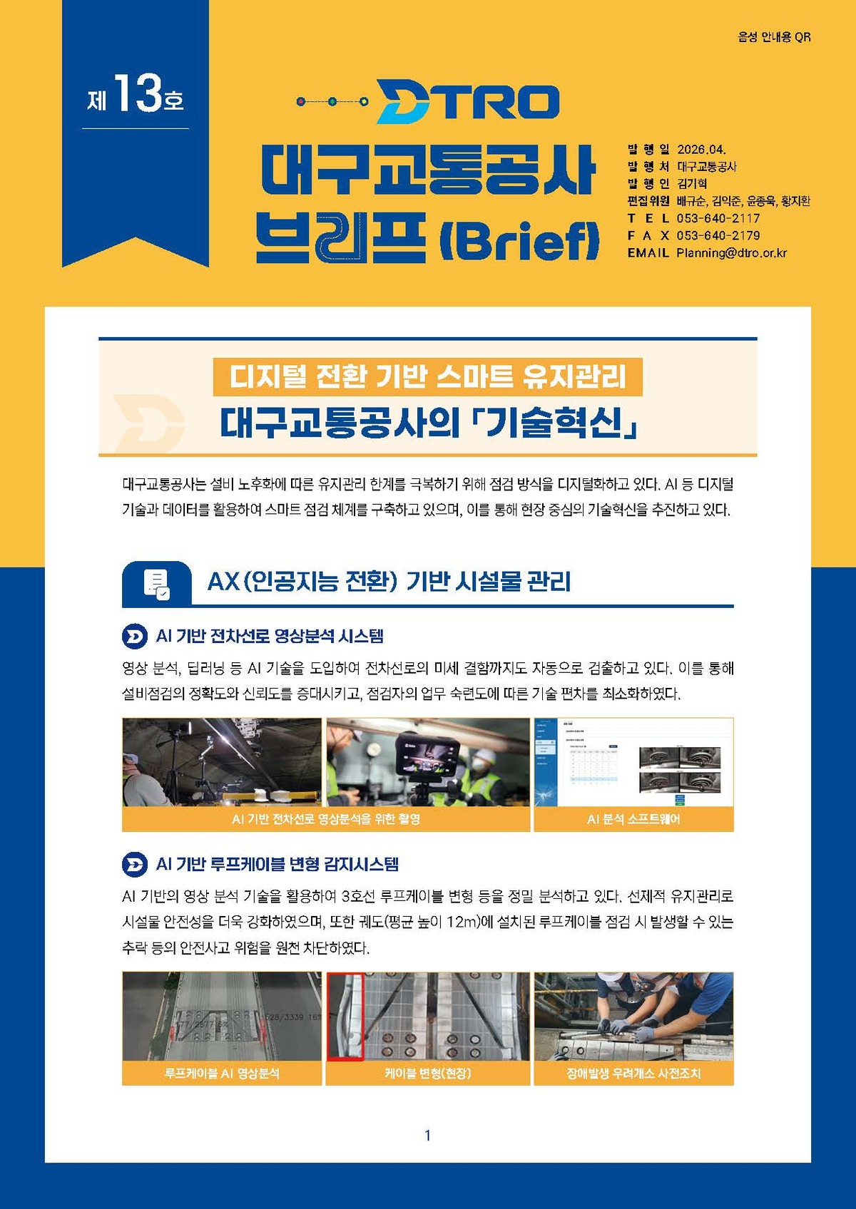 14일 대구교통공사에 따르면, 공사는 2023년 5월 브리프 창간호를 시작으로 올해 1월부터는 매월 정기 발간 체계를 구축해 운영 중이다. 발간된 브리프는 공사 홈페이지에 게시되며, 유관기관에도 배포해 누구나 공사의 주요 정책을 쉽게 확인할 수 있다.