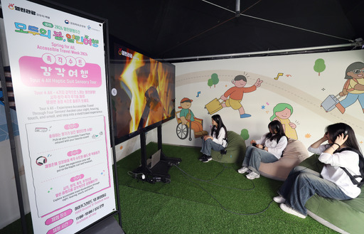 14일 서울 중구 한국관광공사 서울센터 내 하이커그라운드에서 열린 ‘열린여행 주간’ 캠페인에서 시민들이 촉각수트와 헤드셋을 착용하고 감각여행을 체험하고 있다. 문화체육관광부와 한국관광공사가 장애인의 날(4월 20일)을 앞두고 장애인과 고령자, 영유아 동반 가족 등 관광취약계층을 포함한 모든 국민이 제약 없이 여행을 즐길 수 있는 무장애 관광 환경 조성과 시민 인식 개선을 위해 마련한 이번 캠페인은 이달 30일까지 진행된다.
