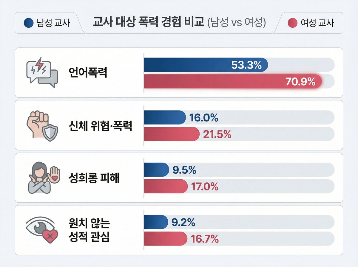 다른 직군과 비교하면 격차는 더욱 극명하다. 산업안전보건연구원의 근로환경조사에서 일반 취업자의 신체 폭력 경험은 0.5% 수준에 불과했다. 교사들이 일반 직장인보다 약 41배나 더 많은 폭력 위험에 노출되어 있는 셈이다.