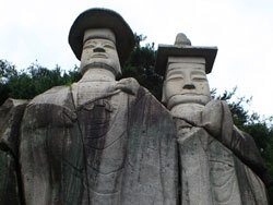 경기도 파주 용미리에 위치한 마애이불입상(보물 제93호). 거대한 천연 암벽에 새겨진 두 기의 불상은 각각 원립관(圓笠冠, 왼쪽)과 방립관(方笠冠)을 쓰고 있는데, 민간에서는 이를 남녀 미륵, 혹은 부모 미륵으로 숭배해 왔다. 이는 미래의 구원 섭리가 음양(陰陽)의 조화와 부모성의 합일을 통해 완성됨을 보여주는 소중한 문화적 증거다. 출처: Wikimedia commons(https://creativecommons.org/licenses/by-sa/4.0/)