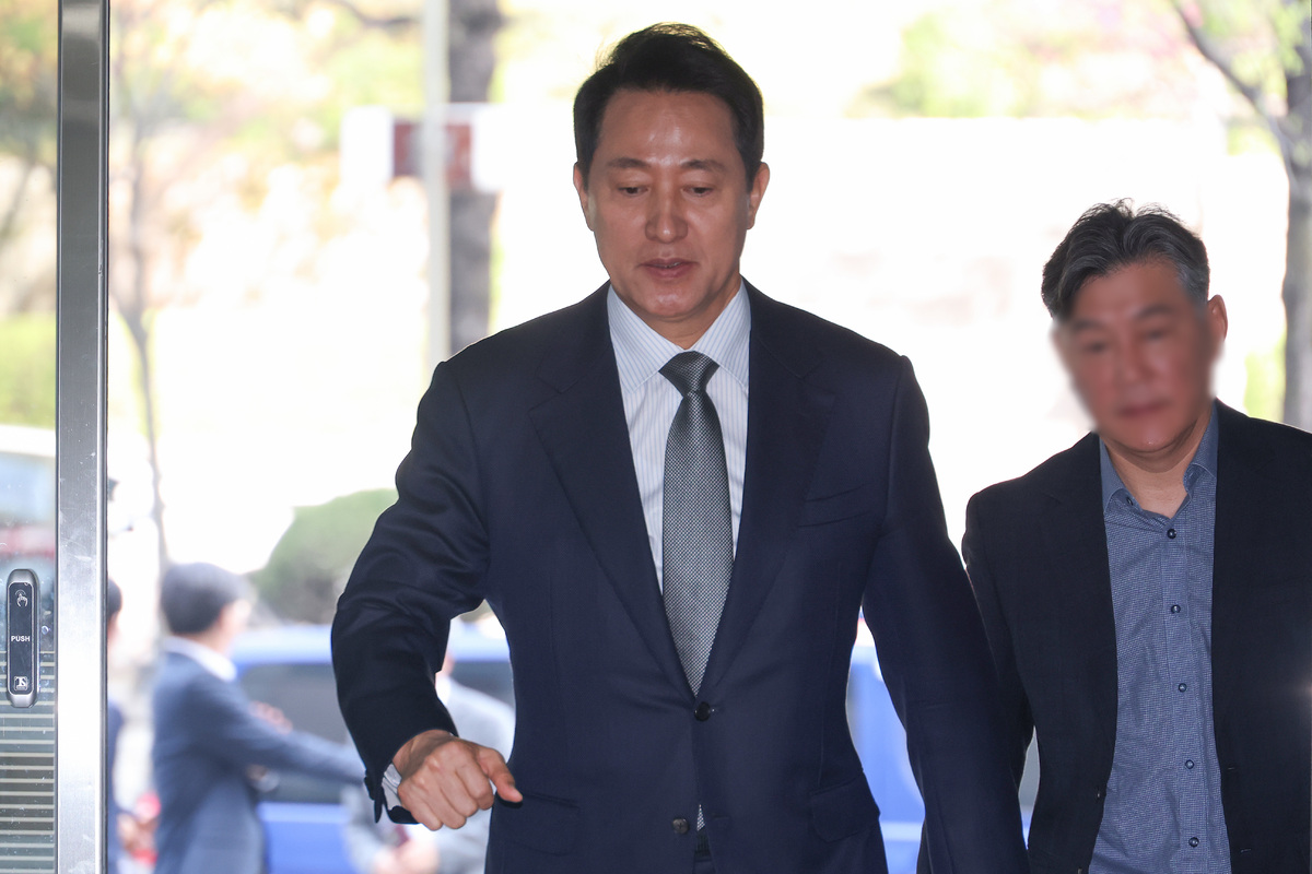여론조사비 대납 의혹을 받는 오세훈 서울시장이 15일 서울 서초구 서울중앙지방법원에서 열린 정치자금법 위반 관련 공판에 출석하고 있다.