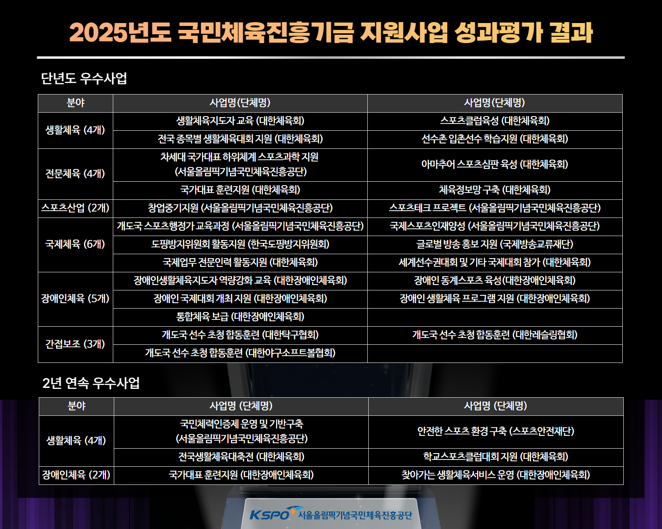 평가 결과, ‘국민체력 인증제 운영 및 기반 구축’, ‘전국생활체육대축전’, ‘장애인 국가대표 훈련 지원’ 등 6개 사업은 2년 연속 우수 사업으로 뽑히는 영예를 안았다. 이들 사업의 담당자에게는 이사장 표창과 함께 해외 단기 연수라는 파격적인 특전이 제공된다. 또 ‘생활체육지도자 교육’, ‘개도국 스포츠 행정가 교육과정’, ‘도핑방지위원회 활동 지원’ 등 24개 사업은 단년도 우수 사업으로 선정돼 이사장 표창과 포상금을 받게 된다.
