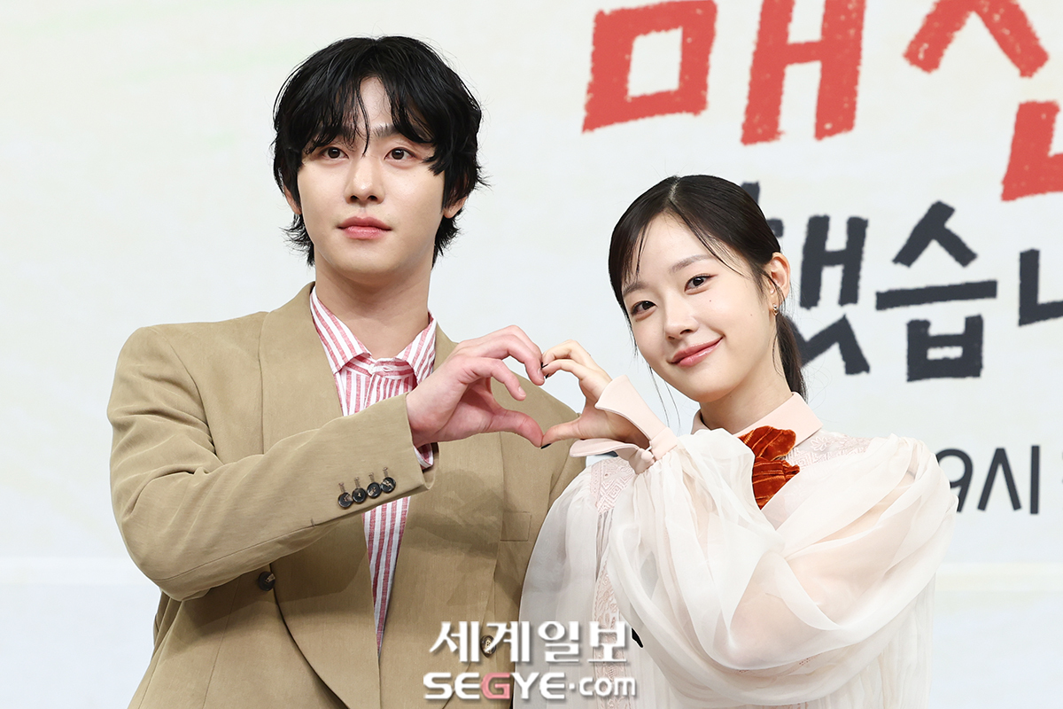 배우 안효섭(사진 왼쪽)과 채원빈15일 서울 목동 SBS에서 열린 새 수목드라마 ’오늘도 매진했습니다’의 제작발표회에 참석해 포즈를 취하고 있다.