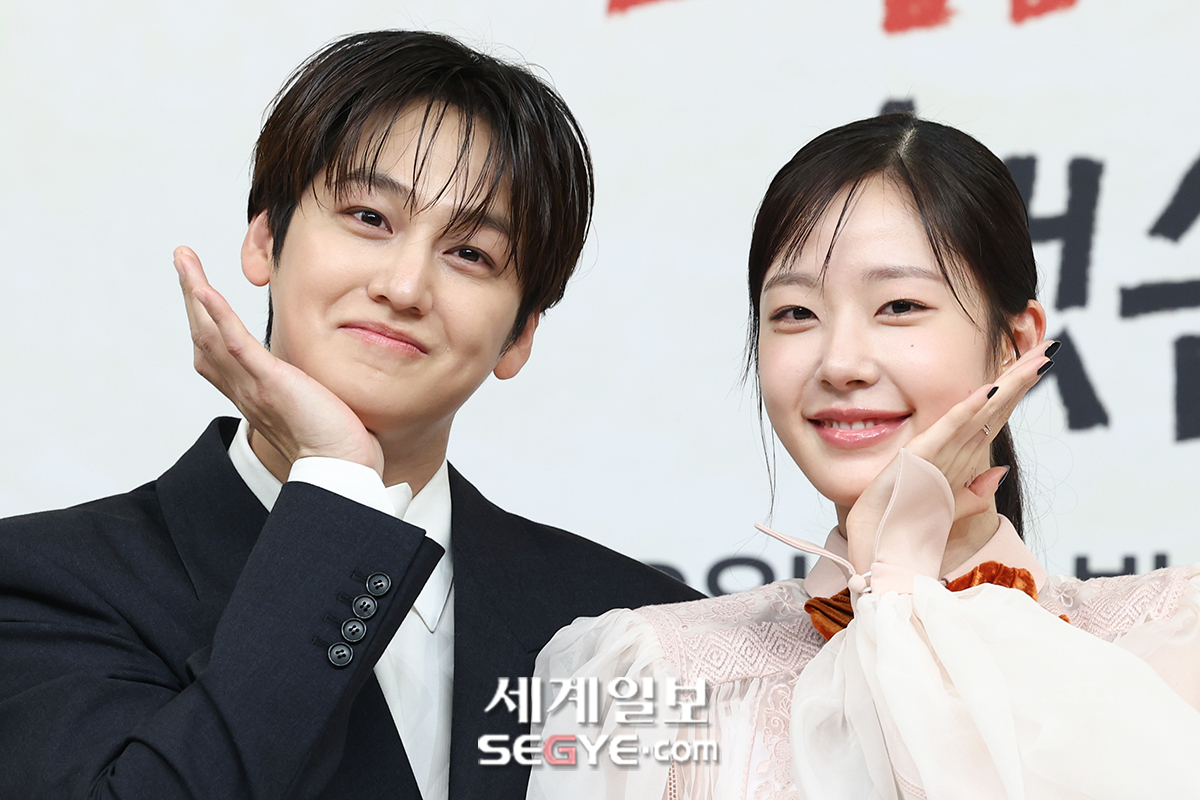 배우 김범(사진 왼쪽)과 채원빈15일 서울 목동 SBS에서 열린 새 수목드라마 ’오늘도 매진했습니다’의 제작발표회에 참석해 포즈를 취하고 있다.