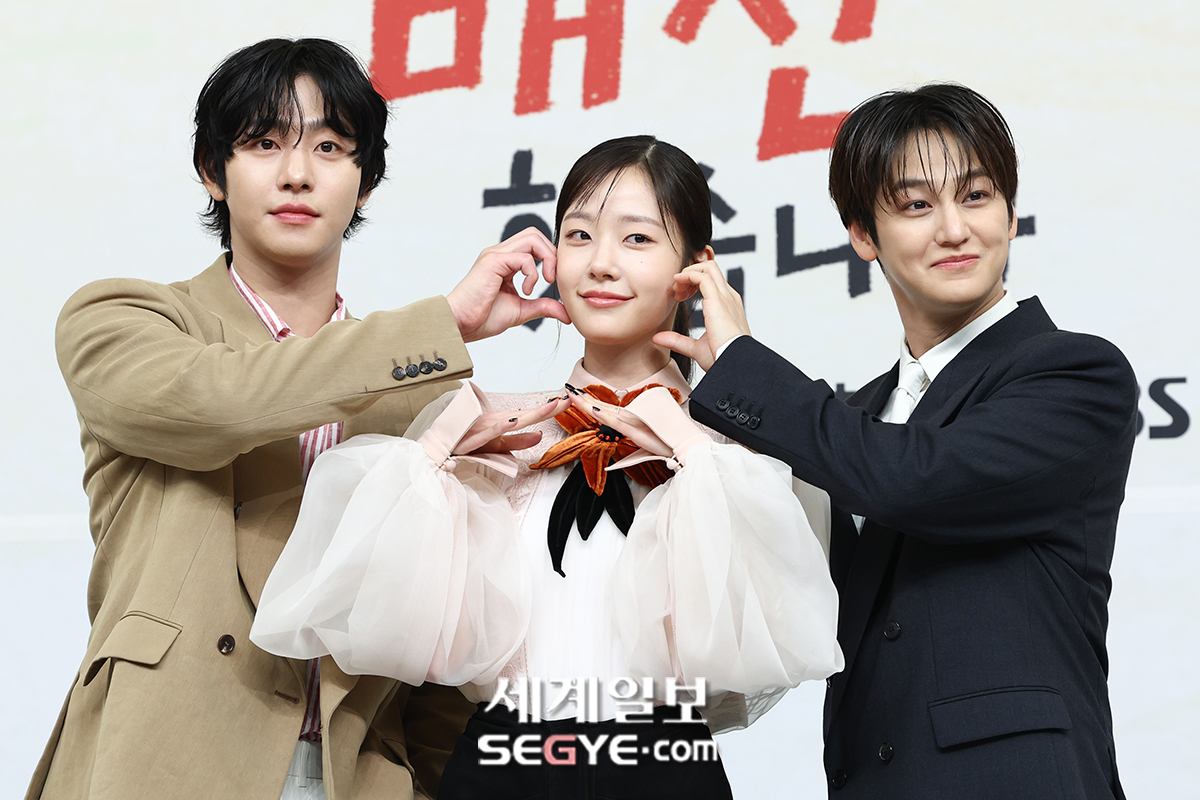 배우 안효섭, 채원빈, 김범이 15일 서울 목동 SBS에서 열린 새 수목드라마 ’오늘도 매진했습니다’의 제작발표회에 참석해 포즈를 취하고 있다.