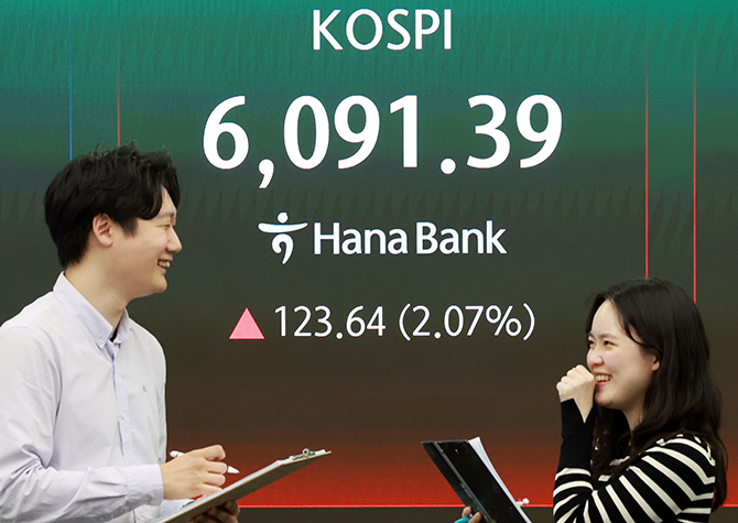 이날 코스피는 전장보다 123.64포인트(2.07%) 오른 6,091.39에 거래를 마감했다.