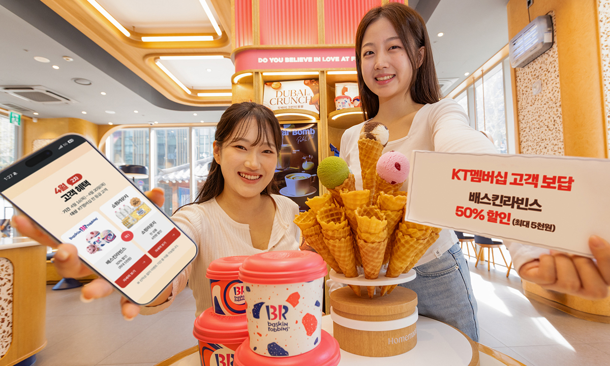 15일 모델들이 KT 멤버십 혜택인 ‘4월 고객 보답 프로그램’과 ‘달달혜택’을 소개하고 있다. KT는 이달 배스킨라빈스 50% 할인이나 쇼핑라운지 6000원 할인 등 식음료와 생필품으로 구성한 멤버십 혜택을 제공한다.