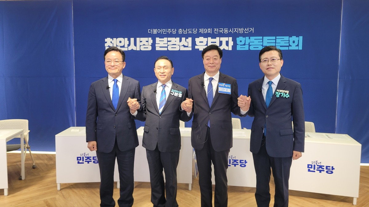 1차 경선을 거쳐 2라운드에 진출한 더불어민주당 천안시장 예비후보 4인이 15일 천안시 불당동 신불당아트센터에서 열린 합동토론회에서 교통·산업·민생 공약을 두고 격돌했다. 정책 경쟁으로 시작된 토론은 재원 논쟁과 도덕성 검증까지 이어지며 사실상 본선급 공방 양상으로 전개됐다.