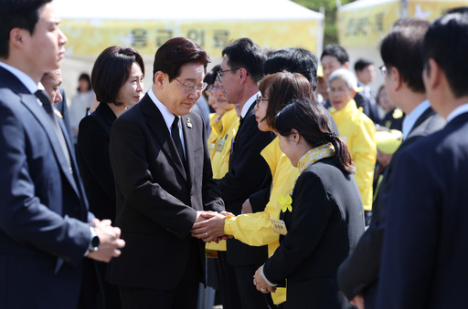 이재명 대통령과 김혜경 여사가 16일 경기 안산시 단원구 화랑유원지에서 열린 ‘세월호 참사 12주기 추모 기억식’에 참석해 희생자 유가족들과 인사하고 있다.
