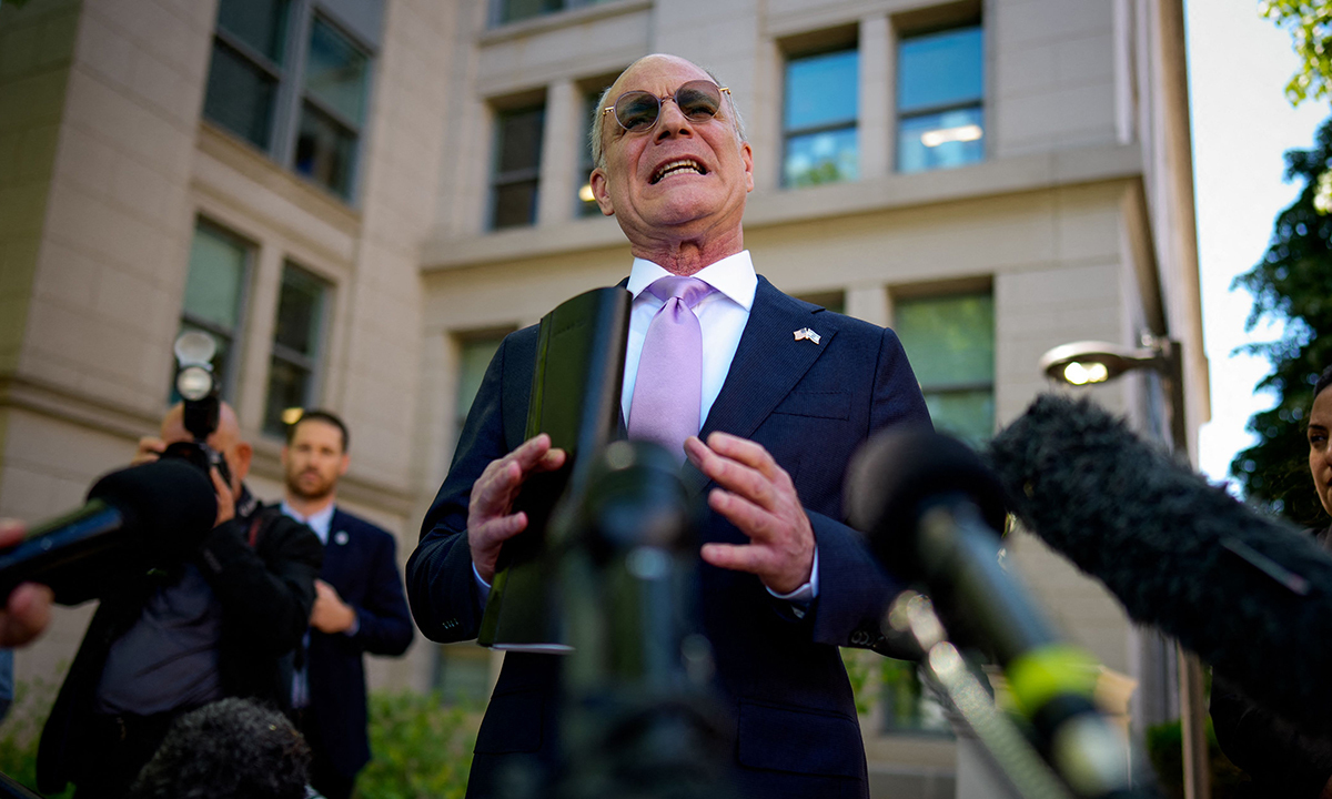 14일(현지시간) 예키엘 라이터 주미 이스라엘 대사가 워싱턴 DC에서 마르코 루비오 미국 국무장관, 나다 하마데 주미 레바논 대사와 실무 평화 회담을 마친 후 인터뷰를 하고 있다. AFP연합뉴스