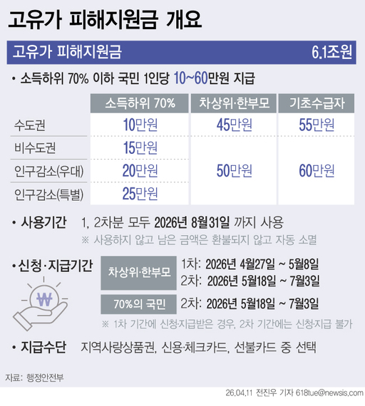 한편 고유가 피해지원금 1차 신청·지급은 기초생활수급자, 차상위계층, 한부모가족을 대상으로 이달 27일부터 시작된다. 나머지는 5월 18일부터 7월 3일까지 신청·지급이 이뤄진다.