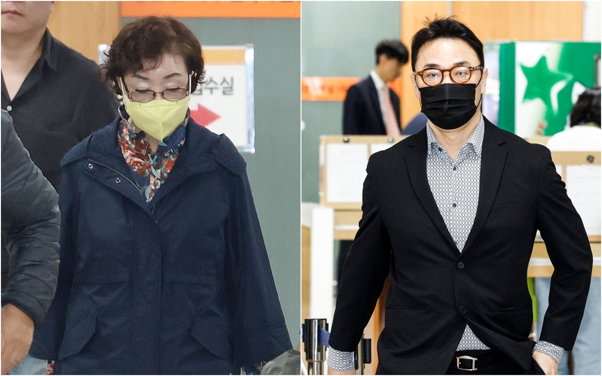 김건희 씨 모친 최은순(왼쪽) 씨와 오빠 김진우 씨가 17일 오후 서울 서초구 서울중앙지방법원에서 열린 특정경제범죄 가중처벌 등에 관한 법률 위반(배임) 등 혐의 관련 공판에 출석하고 있다.