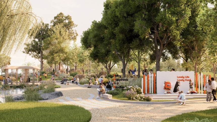 농심은 신라면 40주년을 맞아 ‘라면에 담긴 매콤한 행복(Spicy Happiness In Noodles)’ 정원을 조성한다. 약 1428㎡ 규모 공간에 면발의 곡선과 끓는 물의 기포를 형상화한 조형물을 배치하고, 중앙에는 ‘라면 그릇’ 형태의 파빌리온을 세운다. 관람객이 그 안에 들어가 체험하는 구조다.