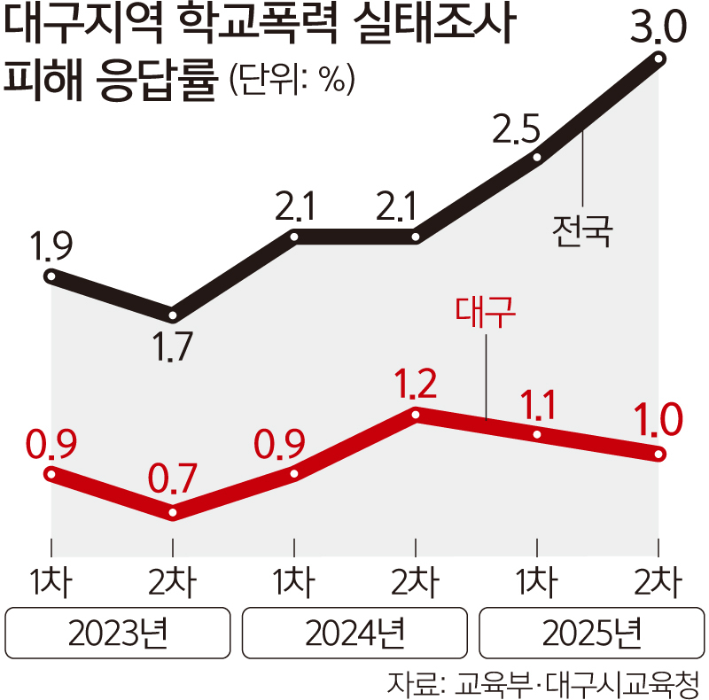 19일 대구시교육청에 따르면 교육부가 최근 발표한 ‘2025년 하반기 학교폭력 실태조사’ 결과 대구의 피해 응답률은 1.0%를 기록했다. 이는 전국 평균(3.0%)의 3분의 1 수준으로, 대구는 이번 조사에서 14년 연속 전국 최저치를 경신하게 됐다.