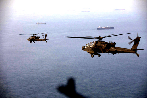 미군 AH-64 아파치 헬기가 17일(현지시간) 호르무즈해협 상공을 비행하고 있다. 이란은 이날 호르무즈해협 개방을 선언했으나 이튿날 다시 폐쇄 방침을 밝히면서 미국과 이란 간 협상 결과를 둘러싼 불확실성이 한층 커졌다.