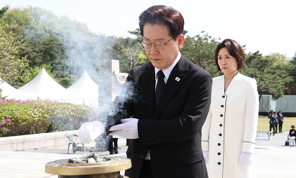 이 대통령은 “민주유공자들과 선열들이 그토록 간절히 소망했던 국민이 주인인 나라를 향해, 흔들림 없이 뚜벅뚜벅 나아가겠다”며 “대한국민의 DNA에 오롯이 남겨진 자유와 평등, 통합과 연대의 민주주의를 더욱 빛나는 미래로 물려줄 수 있도록 온 힘을 다하겠다”고 다짐했다. 이어 “사람의 목숨은 누구에게나 똑같다”며 “모두를 위해 목숨을 던질 수 있는 것도 아무나 할 수 있는 일이 아니다. 그렇기 때문에 우리는 기억해야 하는 것”이라고 했다.
