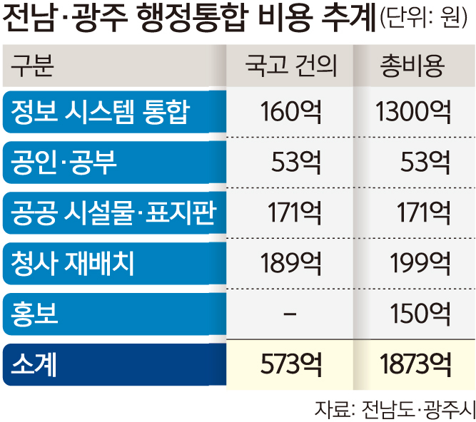 7월 공식 출범하는 전남도와 광주시의 최소 행정통합 비용이 1800억원을 웃도는 것으로 추산됐다. 하지만 최근 추가경정예산에서 전남·광주 행정통합을 위한 국고 지원분 573억원이 전액 삭감되면서 한 해 5조원씩 최대 20조원을 지원하겠다고 공언한 중앙정부가 최소한의 통합비용 지원에 미온적인 것 아니냐는 지적이 나오고 있다.