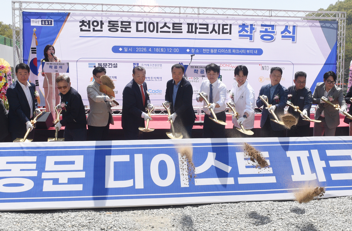천안시 삼룡동 ‘동문 디이스트 파크시티’ 사업부지에서는 착공식이 18일 열렸다. 이날 행사에는 조합원과 관계자, 토지주, 지역구 국회의원 등 300여명이 참석해 사업 재개의 의미를 함께 나눴다.