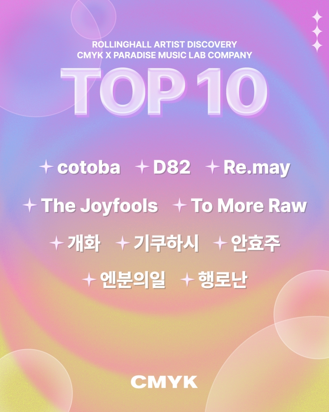 음악의 성지 ‘롤링홀’이 파라다이스 뮤직 랩 컴퍼니와 함께 손을 잡고 개최한 신인 뮤지션 발굴 프로젝트 ‘CMYK 2026’의 본선 TOP10을 20일 발표했다.