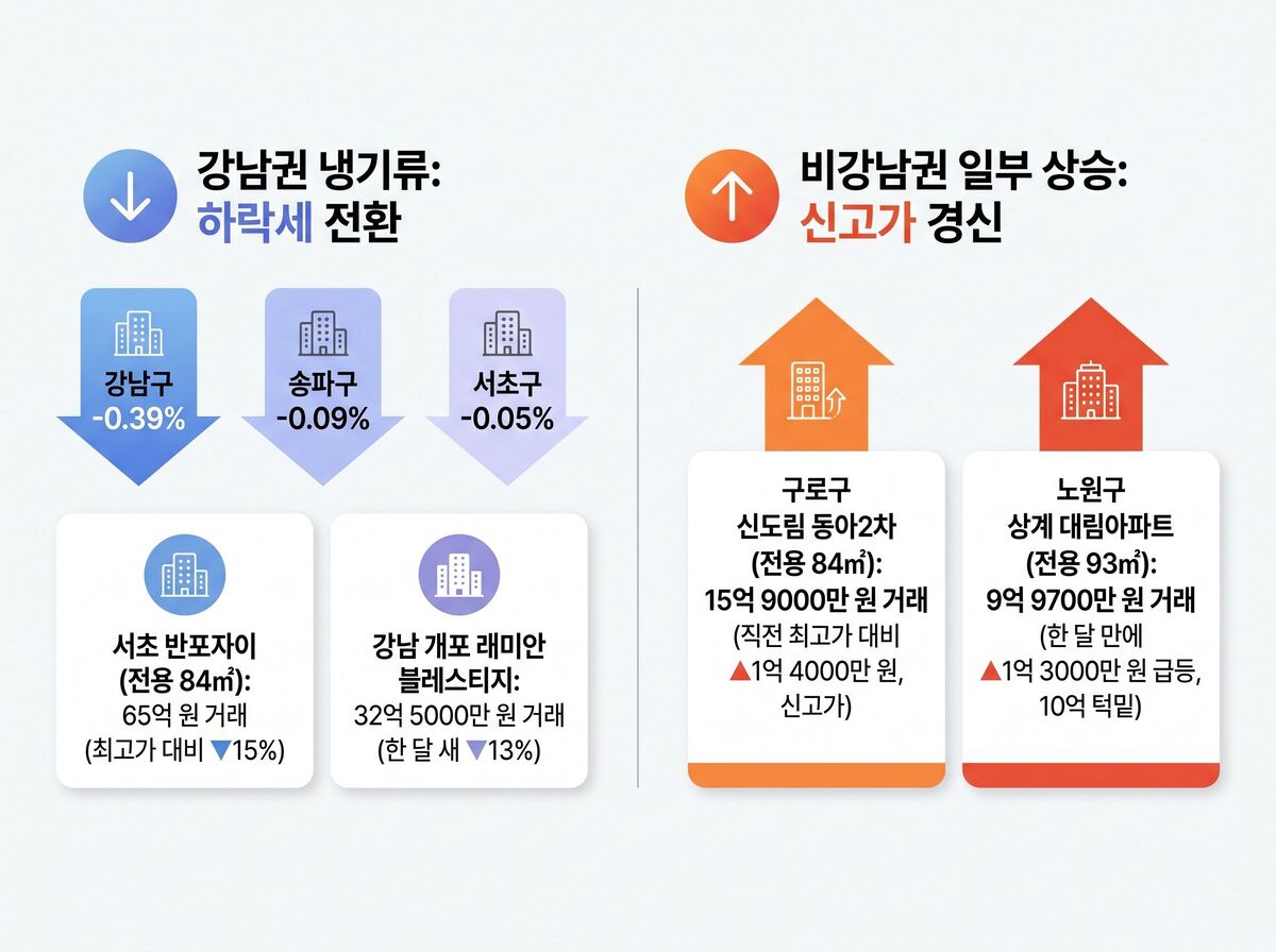 서울 부동산 시장이 한 지붕 두 가족 형태의 극심한 ‘디커플링(비동조화)’ 국면에 진입했다. 강남권 초고가 단지들이 다주택자 급매물에 수억 원씩 몸값을 낮추는 사이, 외곽 지역은 전세난을 견디지 못한 실수요자들이 매매로 돌아서며 신고가 랠리를 이어가는 양상이다.