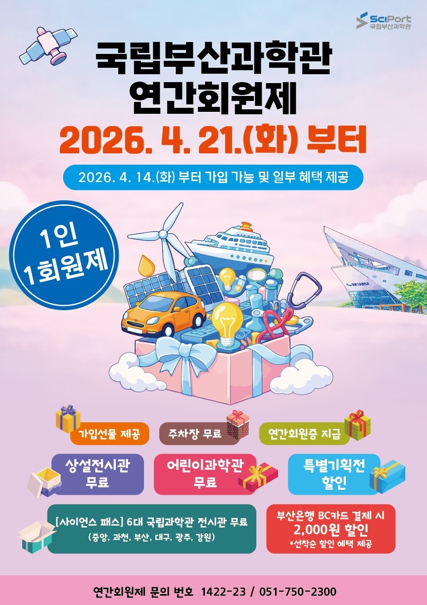 부산과학관 연간회원에게는 △상설전시관 및 어린이과학관 무료 △특별기획전 우대 요금 적용 △주차료 무료(1대 지정) △가입 감사 선물 증정 등 풍성한 혜택이 제공된다. 가입비는 일반 3만원(다자녀 가정 2만원, 우대 고객 1만원)이며, 재가입 시 10% 할인이 적용된다. 연간회원 가입은 부산과학관 본관 1층 종합안내데스크에서 신청하면 된다.