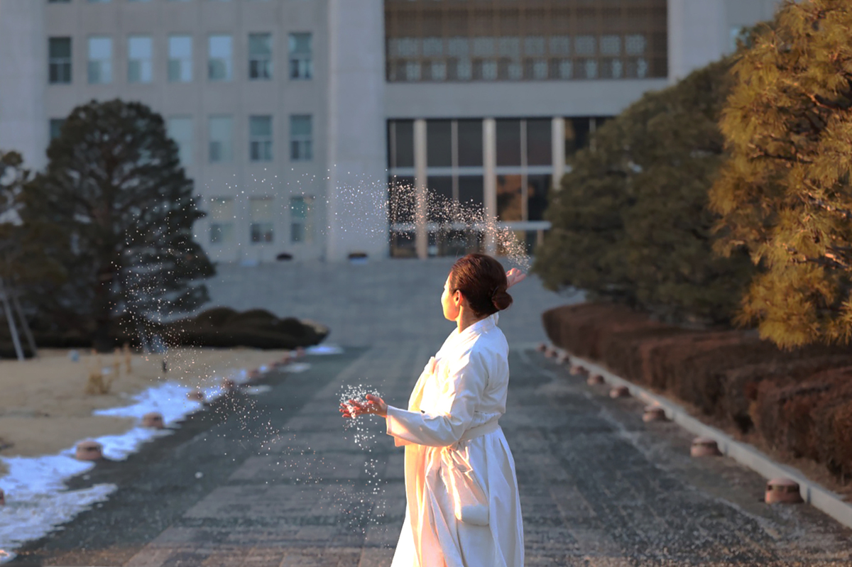 먼저 퍼포먼스 영상 ‘소금을 치다’는 흰 무명 한복을 입고 한겨울에 버선발과 맨발로 상처 입은 작가가 ‘헌법적 치유자’로서 소금을 던지며 침묵을 강요당한 헌법 정신을 깨우는 정화의 세례를 펼치는 모습이 담겨 있다.