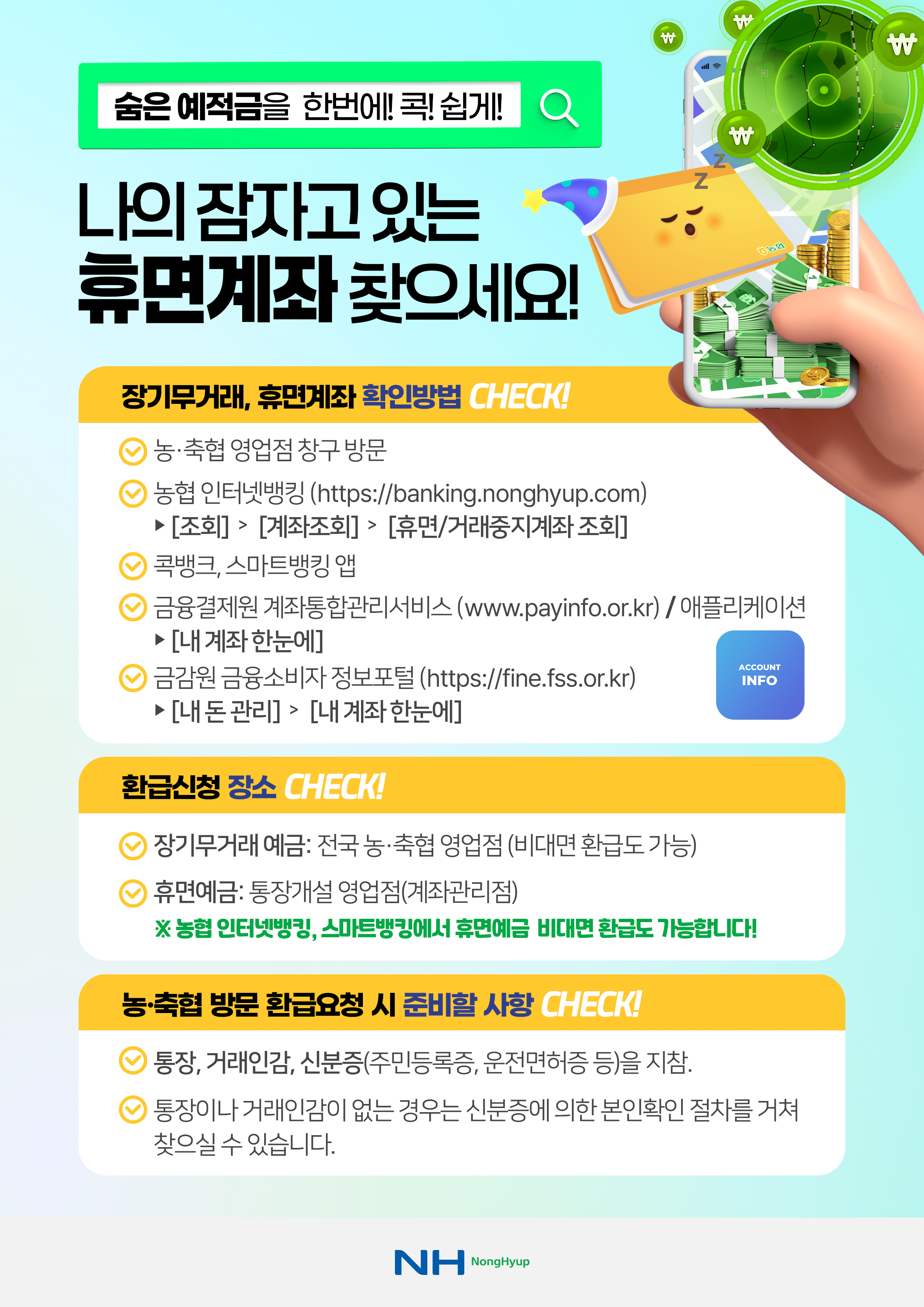 환급대상 금융자산은 만기일이 1년 이상 경과한 장기무거래예금과 일정기간(5년, 조합원은 10년) 거래가 없는 휴면예금으로, 전국 농축협 영업점은 물론, NH콕뱅크와 NH스마트뱅킹 앱을 통해서도 간편하게 조회 및 환급 신청이 가능하다.