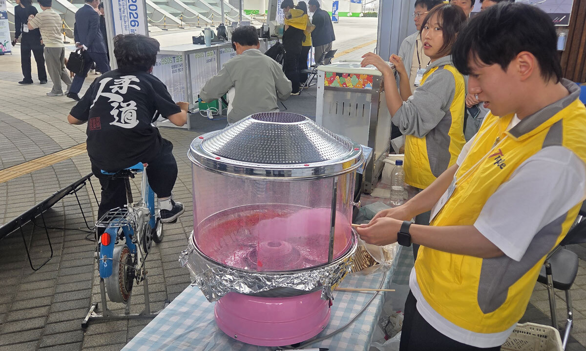 20일 전남 여수세계박람회장 엑스포디지털갤러리. ‘기후변화주간 홍보부스’가 들어선 전시장 한편에서 축전기가 달린 자전거 두 대가 쉴 새 없이 돌아가고 있었다. 아이들이 힘껏 페달을 밟을 때마다 전기가 만들어졌고, 낮 동안 태양열로 생산해 저장해둔 전기와 더해져 분홍 솜사탕이 피어오르고 팝콘이 튀겨졌다.