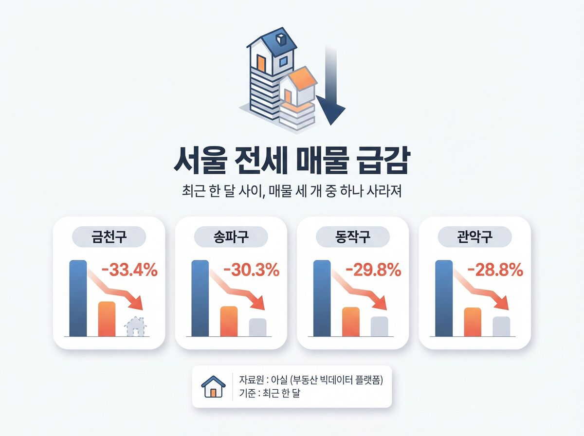 21일 부동산 빅데이터 플랫폼 아실에 따르면 최근 한 달 사이 금천구(-33.4%)와 송파구(-30.3%)의 전세 매물은 30% 이상 급감했다. 동작구(-29.8%)와 관악구(-28.8%) 등 서울 전역에서 매물 세 개 중 하나가 사라진 셈이다.