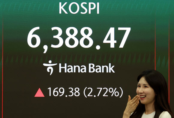 이날 코스피는 전장보다 169.38포인트(2.72%) 오른 6,388.47에 거래를 마치며 지난 2월 26일 기록한 종가 기준 사상 최고점(6,307.27)을 약 2개월 만에 경신했다.