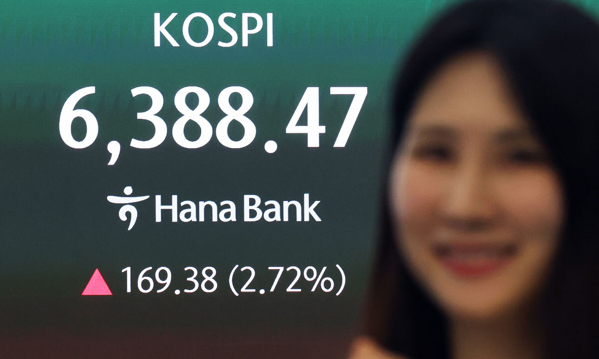 한국거래소에 따르면 이날 코스피는 전장보다 169.38포인트(2.72%) 오른 6388.47에 거래를 마쳤다. 전쟁 발발 이전인 2월26일 기록한 종가 기준 사상 최고치(6307.27)를 약 2개월 만에 경신했다. 2월27일 찍은 장중 사상 최고치(6347.41)도 뛰어넘었다. 지수는 83.45포인트(1.34%) 상승한 6302.54로 출발해 단숨에 6300선을 돌파한 뒤 상승 폭을 키우며 안정적인 흐름을 보였다. 외국인과 기관이 각각 1조3296억원, 7371억원을 순매수하며 지수를 끌어올렸다. 반면 개인은 1조9195억원을 팔아치우며 대거 차익 실현에 나섰다.