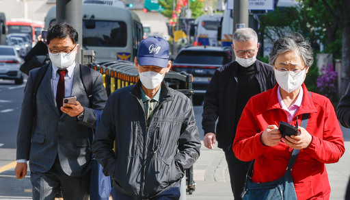 차가운 북서풍 영향으로 전국 대부분 지방에 황사 위기 경보 ‘관심’ 단계가 내려진 21일 서울 종로구 광화문광장에서 시민들이 마스크를 쓴 채 횡단보도를 건너고 있다.