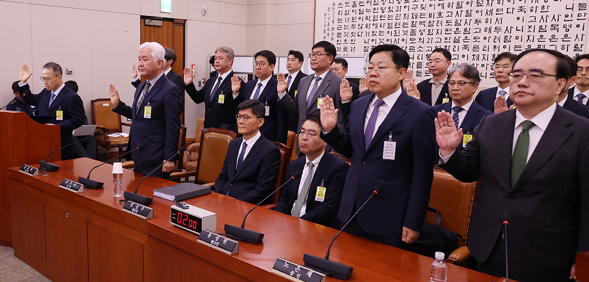 21일 서울 여의도 국회에서 열린 ‘윤석열 정권 정치검찰 조작기소 의혹 사건 진상규명 국정조사 특별위원회’ 청문회에서 김규현 전 국가정보원장(왼쪽)을 비롯한 증인들이 선서를 하고 있다. 이날 청문회에선 국가통계 조작 사건, 서해 공무원 피격 사건 등 윤석열정부 당시 감사원과 검찰이 조사했던 사안을 놓고 여야가 충돌했다.