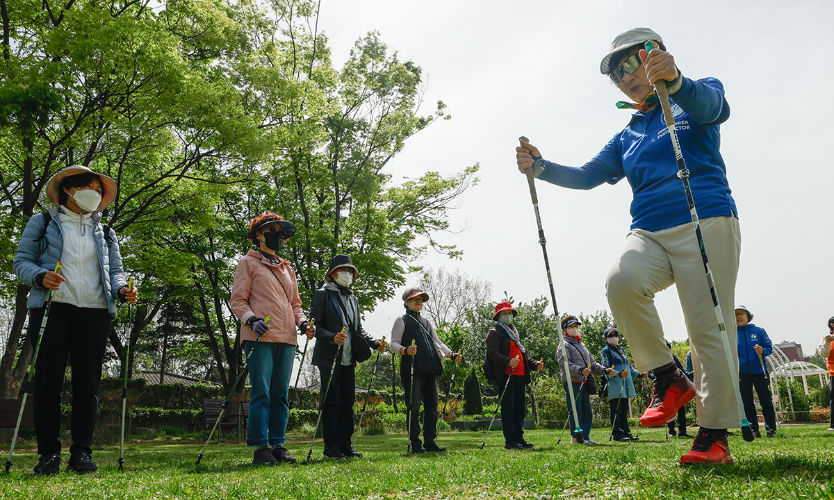 21일 서울 용산구 용산가족공원에서 치매극복 걷기대회가 열린 가운데 어르신들이 노르딕워킹 체험을 하고 있다. 특별제작된 스틱을 사용해 걷는 노르딕워킹은 핀란드 크로스컨트리스키 선수들이 비시즌인 여름에도 몸의 상태를 유지하기 위해 개발한 운동으로, 당뇨·고혈압 등과 같은 질환 개선과 척추 교정 등에 효과적이다.