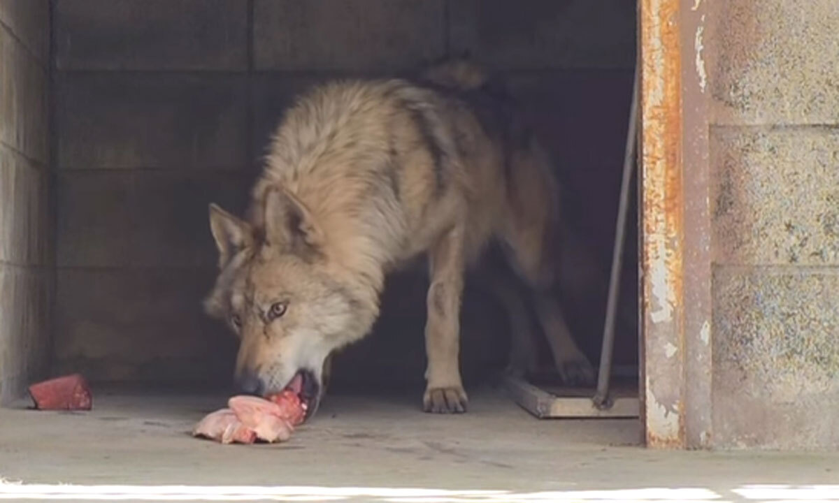 대전 오월드로 돌아온 늑대 ‘늑구’가 바닥에 놓인 고기를 먹고 있다. 오월드 SNS 갈무리