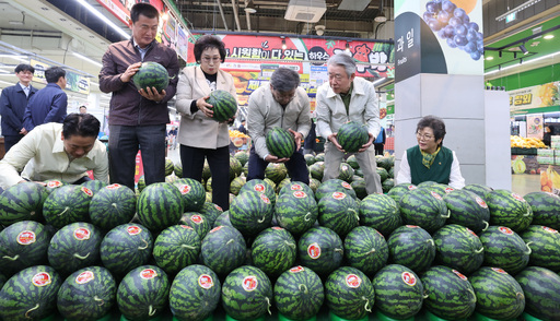 22일 서울 서초구 농협하나로마트 양재점에서 열린 ‘농심!효심!동심!’ 특별할인행사 기념식에서 강호동 농협중앙회장(오른쪽 두번째)과 참석자들이 매대에 진열된 수박을 살펴보고 있다. 물가 부담 완화 차원에서 기획된 이번 행사는 23일부터 다음달 20일까지 전국 하나로마트와 NH싱싱몰, 자재판매장에서 진행된다. 농협은 312억원을 투입해 하나로마트에서 최대 50%, NH싱싱몰에서는 최대 60%까지 할인 폭을 확대한다.
