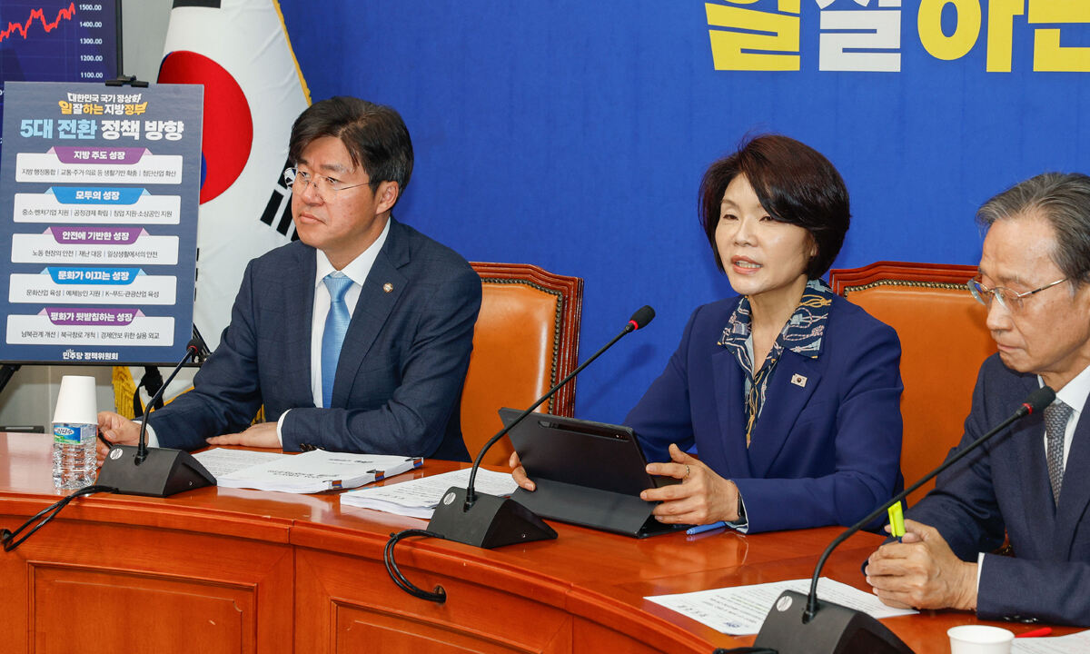 한정애 정책위의장은 이날 국회에서 “지선 공약 핵심 기조는 조속한 국가 정상화 토대 위에서 새로운 산업 성장 등 미래 경제 대도약과 ‘5극 3특’ 지방주도 성장 등 대전환을 추진하는 것”이라며 5대 비전과 15대 정책과제를 공개했다. 이날 공개된 공약체계에 따르면 5대 비전은 △지방주도 성장·국가균형발전 △AI 등 신산업 성장·경제 대도약 △기회보장·국민성공 △민생안전·공정사회 △국가 정상화·국민주권 회복이다.