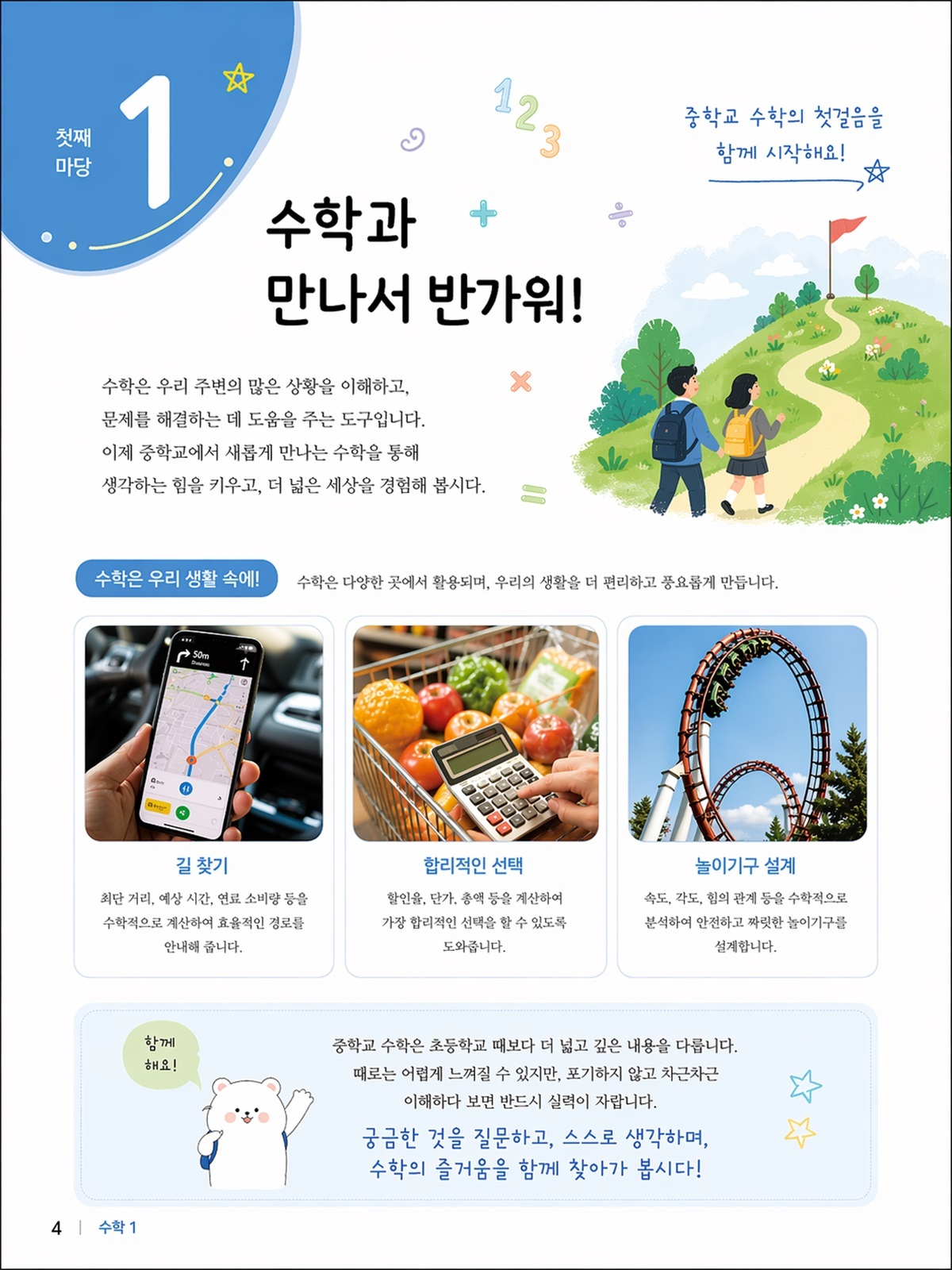 ‘수학은 다양한 곳에서 활용하며 우리의 생활을 더 편리하고 풍요롭게 만든다’는 수학의 본질에 관한 설명까지 제시하면서도, ‘꿹벫숧’ 처럼 생성형 AI에서 한때 많이 볼 수 있었던 정체를 알 수 없는 글자는 어디서도 보이지 않는다. 교과서 출판사에서 갓 내놓았다고 봐도 무방할 정도의 수학 교과서 그래픽 완성본이다.