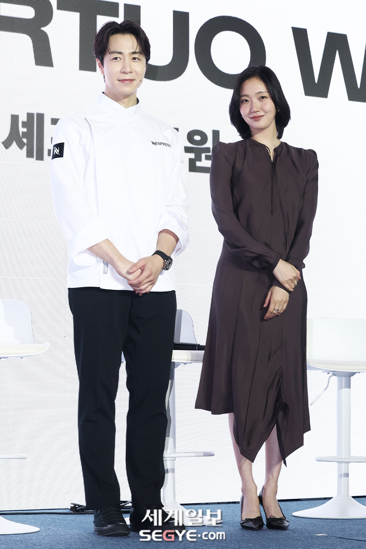 손종원 셰프(사진 왼쪽)와 배우 김고은이 23일 서울 성수동 앤더슨씨에서 열린 커피 브랜드 ‘네스프레소’의 ‘버츄오 월드 미디어 데이’ 행사에 참석해 포즈를 취하고 있다.