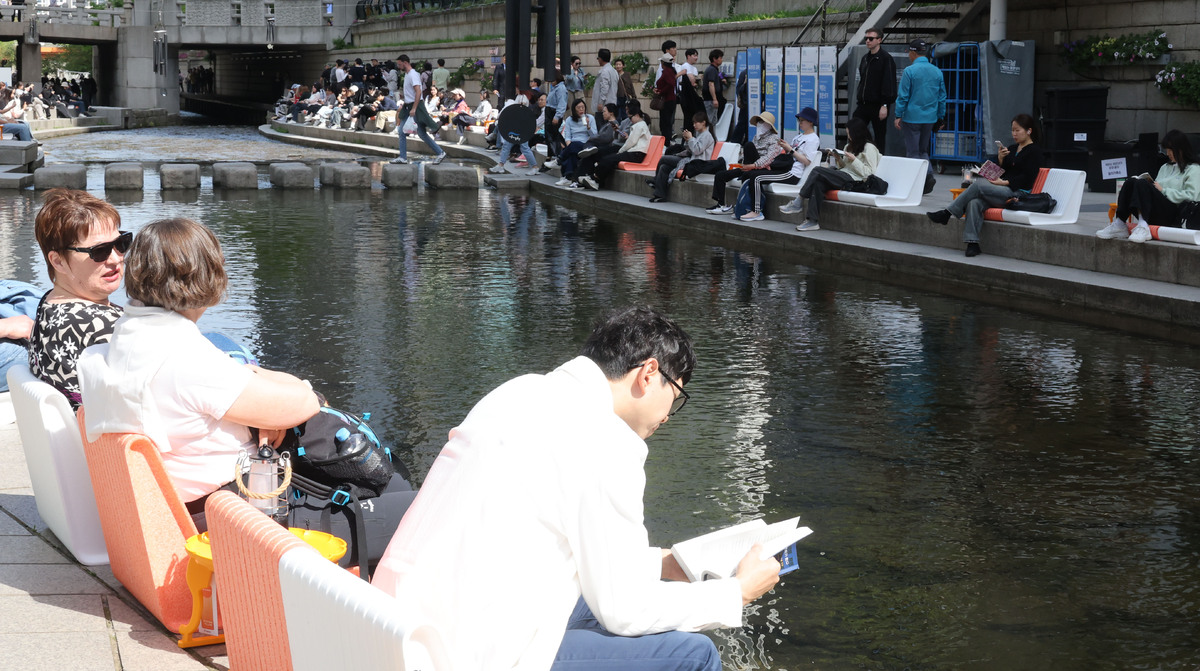 세계 책과 저작권의 날을 맞아 청계천의 ‘책읽는 맑은 냇가’가 개장한 23일 서울 청계천에서 시민과 관광객들이 독서를 하고 있다.